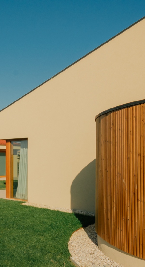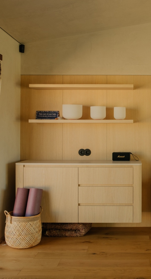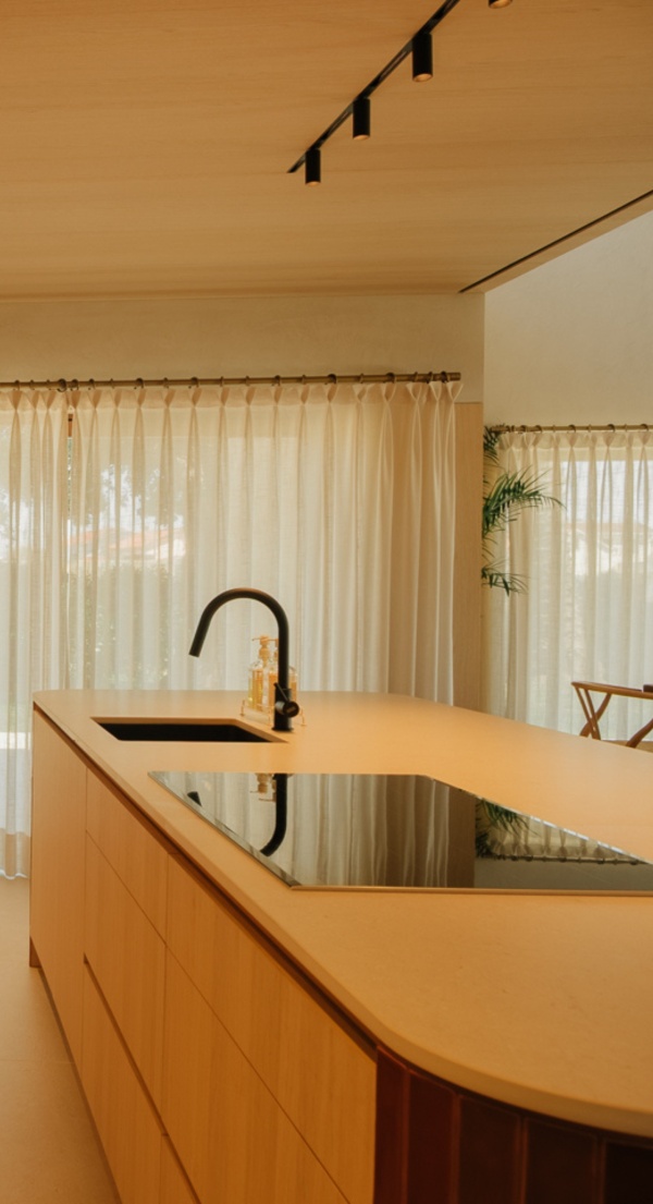 A escolha dos materiais da Casa Ori reflete o compromisso com a autenticidade, a sustentabilidade e o bem-estar. As paredes em Shinnoki trazem a elegância da madeira natural, com um acabamento delicado que exala conforto e harmonia. Já o revestimento exterior em Lunawood, presente na zona do duche, oferece resistência e durabilidade, mantendo uma ligação orgânica com a natureza envolvente. Cada elemento foi selecionado não apenas pela sua qualidade estética, mas pela forma como contribui para o equilíbrio e serenidade do espaço — um verdadeiro diálogo entre design, matéria e natureza.
