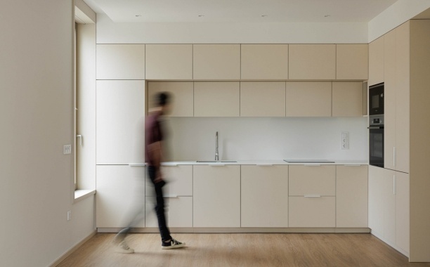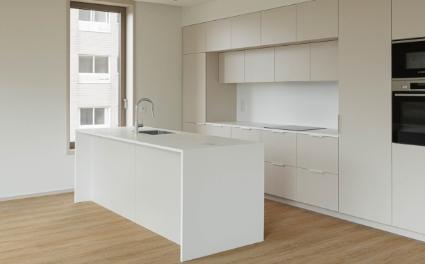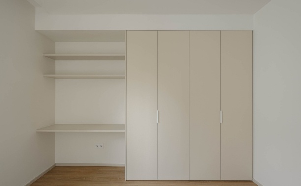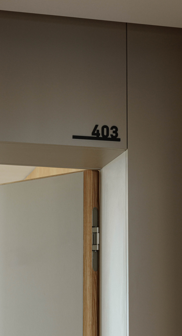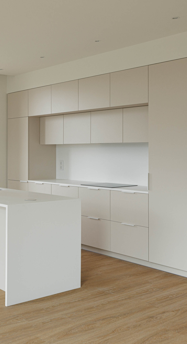 A seleção de materiais no Edifício Macau Valley reflete uma preocupação com a durabilidade, a coerência estética e o conforto visual. Nos acabamentos interiores foram utilizados produtos da marca EGGER, garantindo qualidade técnica e uniformidade. Nas zonas comuns, as paredes foram revestidas a melamina Cinza Argila U727. Já nos rodapés, portas, frentes de roupeiros, cozinhas e armários de WC foi aplicado HPL Bege Rosado U156, conferindo um tom quente e contemporâneo aos espaços. Os interiores dos roupeiros utilizam melamina Têxtil Bege F416, enquanto cozinhas e armários de WC recorrem à melamina Cinza Seixo U201, criando uma paleta equilibrada e harmoniosa.