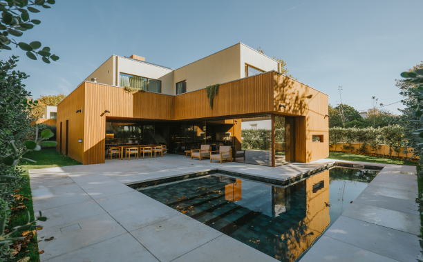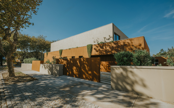 A Moso foi a marca escolhida para o revestimento das fachadas e tetos, com o modelo Varibo N-durance Grad, aplicado num total de 800 m². Reconhecida pela durabilidade e estética natural do bambu, a Moso garante uma solução sustentável e de elevada qualidade. O sistema Grad facilitou significativamente o processo de instalação, assegurando precisão, rapidez e um acabamento uniforme que valoriza o conjunto arquitetónico.